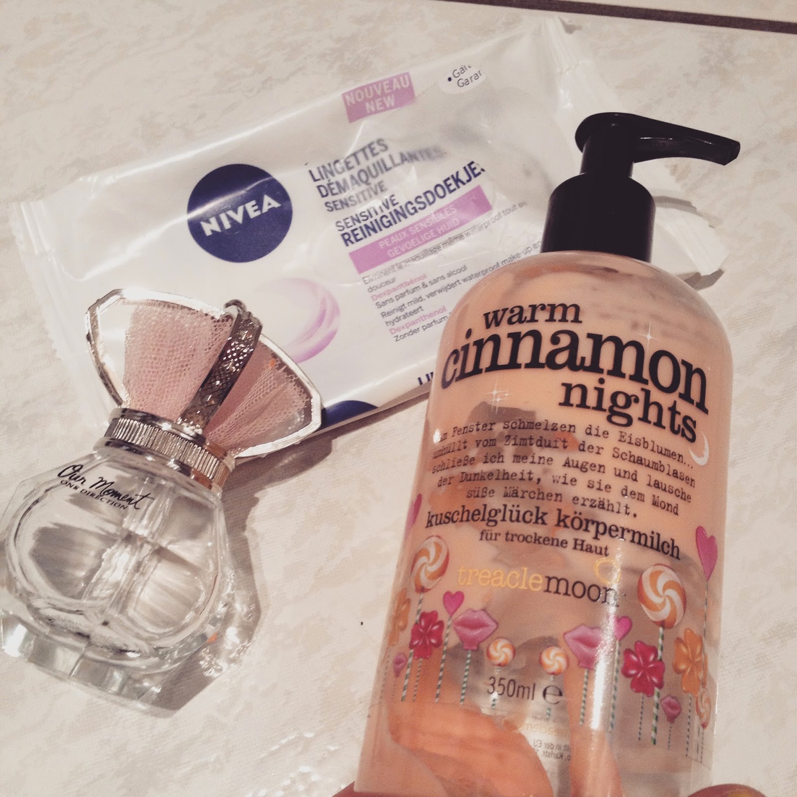 I finally finished my „Our Moment“ perfume by One Direction. I had it for over a year and I recently „re-discovered“ it :) It smells really sweet but I liked it. Next to it we have some Nivea make up remover wipes. They were too dry so I had to put a bit water in it to use them properly. And on the far right is my „warm cinnamon nights" body lotion by TreacleMoon. It smelled amazing and I will repurchase it next Christmas (if they have it back in stock :D)